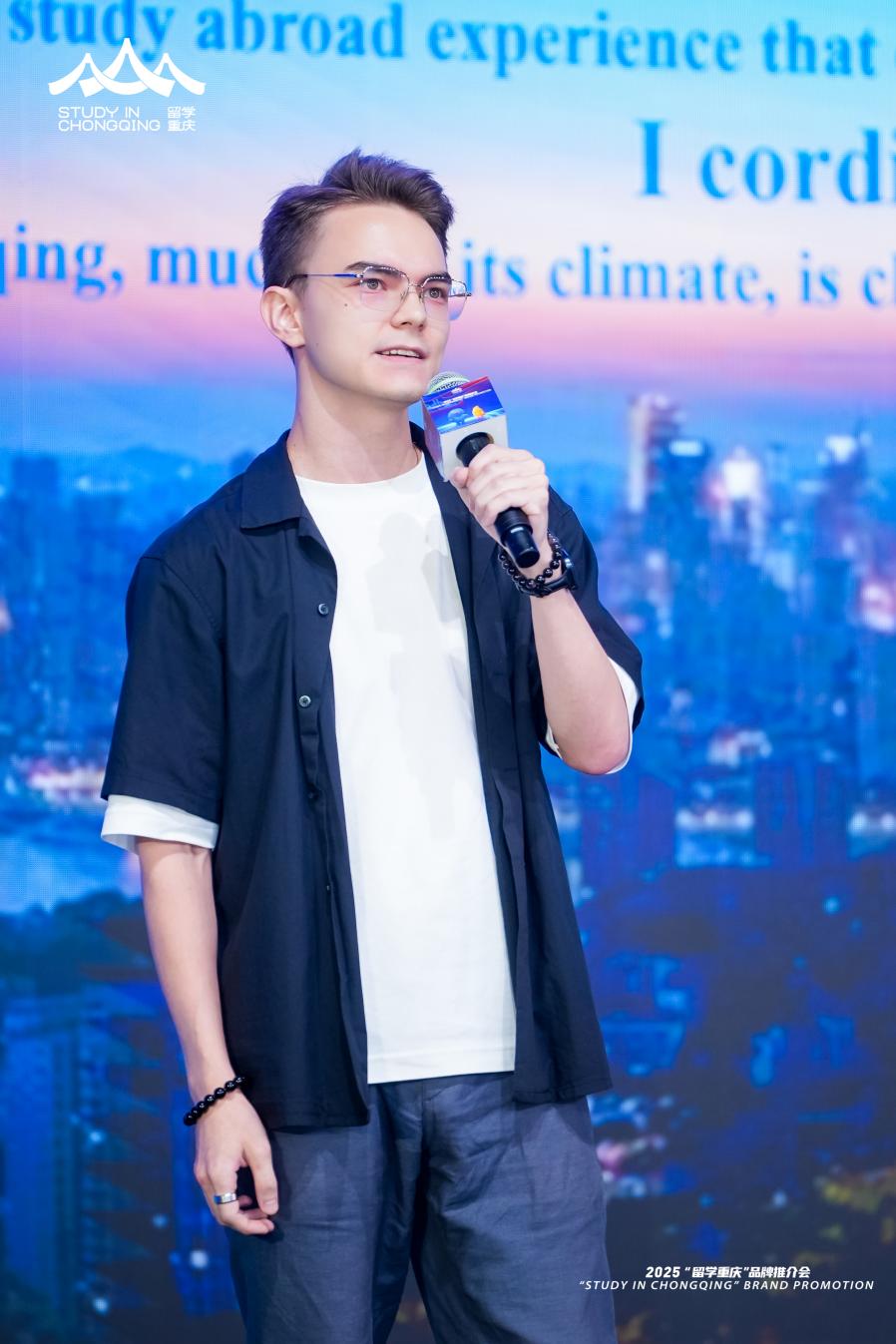 Auf der Veranstaltung teilte der russische Student Anton, Botschafter der „Auslandsstudium in Chongqing“-Promotion, seine persönliche „Chongqing-Geschichte“. Von dem visuellen Staunen über die einzigartige Topographie und das lebendige Stadtleben Chongqings bei seiner Ankunft bis zum Verständnis der lokalen Lebensweisheiten und seinem Wachstum während seines Studiums, sowie die spirituelle Resonanz, die er durch das Studium der chinesischen Sprache und das Eintauchen in die Kultur erlangte – Anton erzählte aufrichtig von seiner beidseitigen Beziehung zu Chongqing. Er lud junge Menschen weltweit enthusiastisch ein: „Kommt nach Chongqing, um hier eine bessere Version von euch selbst zu ‚yu‘-treffen!“ (Wortspiel mit , der Abkürzung von Chongqing)