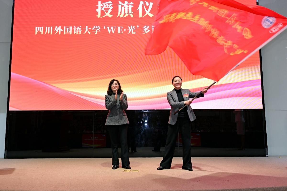 Zang Xiumei überreichte die Fahne an das neu gegründete mehrsprachige Freiwilligenteam "WE·" der SISU.